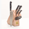 The Mundial K5100-7 Box Cutlery Set with Wood Block from the 5100 Series features fully forged knives, designed for durability and sharpness, along with one kitchen shears, perfect for both professional and home kitchens.